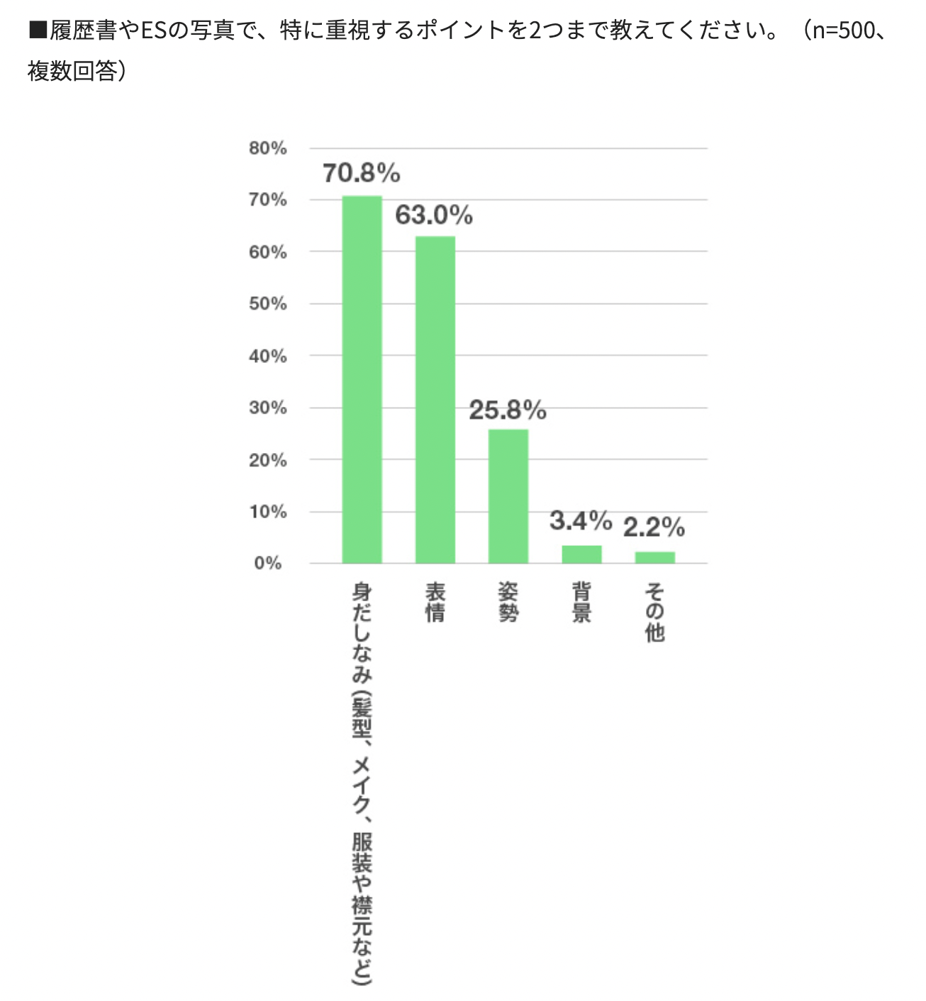 下のグラフからわかるように、人事が証明写真で見ているポイントは「身だしなみ」と「顔の表情」です。
